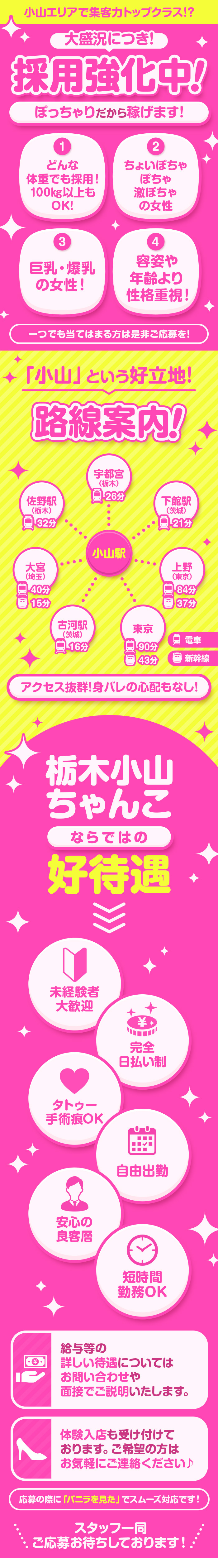 入店までの流れ♪初めまして☆栃木小山ちゃんこです!リニューアルオープンの為女の子が足りません(´;ω;`)応募から体験入店までスピーディーにかつ最短距離で稼げるのが当店の強みです!!最初のは誰でも不安だと思います。最初の一歩が踏み出せるように当店が背中を押します!ステップ1お問い合わせ☆まずはお気軽にお問い合わせください♪例えば、「ぽっちゃりでも大丈夫ですか?」「〇〇歳なんですが?」「初めてで不安です」など、どんな小さなことでも大歓迎です。まずは問い合わせをしてください!どんな不安も丁寧にお答えします!ステップ2面接♪面接当日は最寄り駅までお迎えにあがります。不安や疑問をしっかりとお聞きしてお給料やお仕事内容の詳細についてしっかりご説明いたします。働き方や待遇についてもしっかり確認していただけますので、何でも気軽にご相談ください。もちろん面接だけで帰ることも可能です。無理な勧誘は一切いたしませんので、安心してお越しいただければと思います!「やってみたい!」と思われた方には、即日の体験入店も大歓迎です。まずはお越しいただきスタッフと話をしてみてください!ステップ3実技講習無し!安心安全!当店は!実技講習は一切行いませんので、初めての方でも経験者の方でも安心してご応募いただけます!簡単なマニュアルと口頭説明で後は、お仕事しながら覚えて頂けたら大丈夫です!ステップ4体験入店☆まずは、体験入店で客層や雰囲気を見てください!!体験入店では、雰囲気を感じて頂きたいので、リラックスしてご自分のペースで大丈夫です!勤務後は、お給料を全額その日に日払いでお渡しします! 必ず稼がせます!ステップ5ぽっちゃりだから!自信がないから輝ける!当店では、コンプレックスが最大の武器です!ぽっちゃりだから! 経験ないから! 男性経験少ないから! 年齢が。。。とにかく否定された人生だから。 そんな女性を当店が輝かせます!自分なんか。。私なんか。。という否定を今日からやめましょう!私だから!出来る!そんな自信を持てるお店です!精いっぱい頑張りましょう!!ご応募お待ちしております!