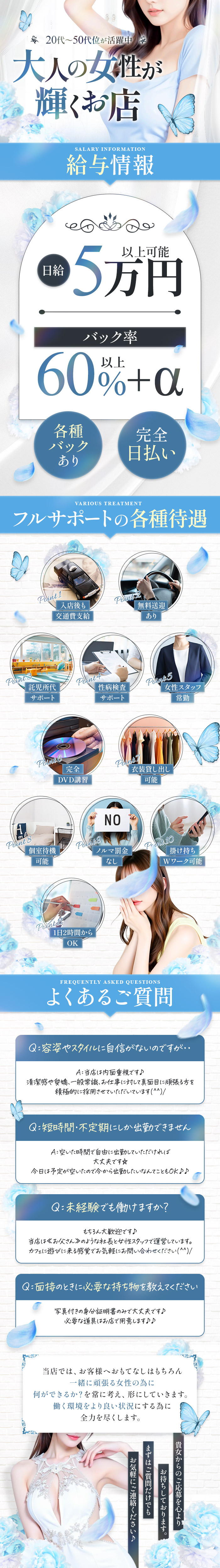 | 応募資格 | 20歳~50歳位までの方!素人・OL・人妻・フリーター・経験者・未経験者問わず大歓迎 |