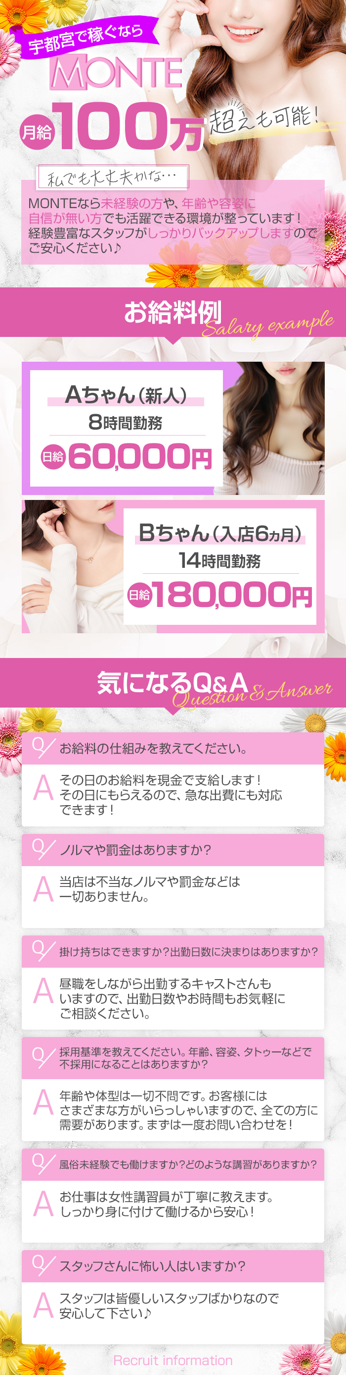 女の子のお仕事に対してノルマや罰金などがないお店だよ♪お店によっては、入店から◯ヶ月以降からはノルマが発生したり、無断欠勤などでは罰金になってしまうなどルールがあったりもするから、入店前にはしっかり聞いてみてね!
