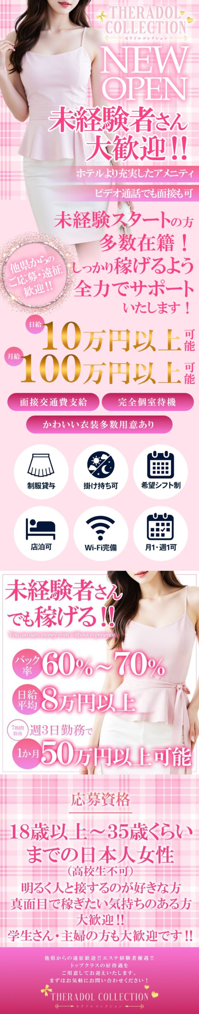 大手グループが経営しているお店だよ。待遇や条件も手厚くて安心だし、集客力もあって女の子が稼ぎやすい!待遇や条件はグループの中でも店舗ごとに変わってくるから、気になるポイントは問い合わせて聞いてみよう♪