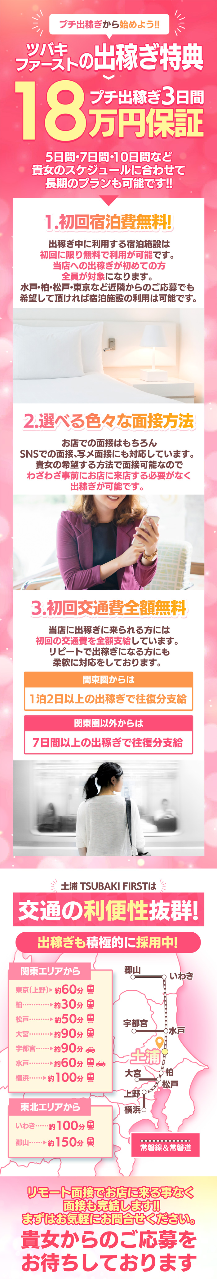 【ツバキ土浦店の信念】 【働いてくれている女性とご利用いただいているお客様に一切の嘘をつかない】 モデルさん(キャストさん)とお客様に対してほんの少しの【嘘】でも【ごまかし】をする時は お店を閉める時という信念がございます。 なのでツバキ土浦店の求人HPに掲載されている事は 全て事実で、嘘は一切ございません! ツバキ土浦店は 『お客様に愛され、女性から信頼されるお店』 を目指しています。 風俗業界は、以前よりは健全化をされてきているとは言え まだまだ、この業界で辛い思いをしている女性が多くいるかもしれません。 そのような女性に、 『本当に自分を大事にしてくれているお店』 があるという事を知って頂けたらと思います。 ツバキ土浦店の一番のオススメポイントは 茨城県1とも言える圧倒的な集客力(お客様来店数)が自慢のお店なので たとえ短時間(3~4時間出勤)であっても絶対に接客0本(お茶、ボウズ)が無い! 出勤さえしていただければ、確実にお給料が発生する【安定】がある事です!